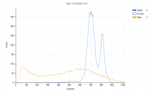Abb.: Alpha-Beta-Spektrum von Rn-222 in Wasser, direkt gemessen mit Triathler™, Extraktionsmethode (LSC-Cocktail: MaxiLight+)